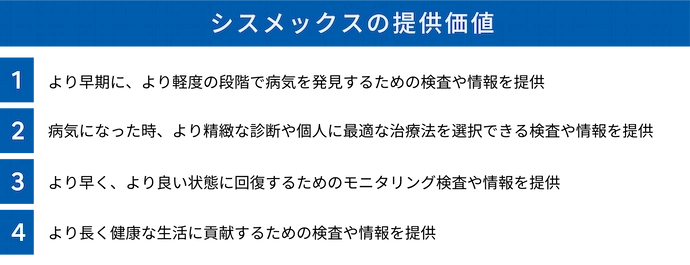 シスメックスの提供価値1:より早期に、より軽度の段階で病気を発見するための検査や情報を提供