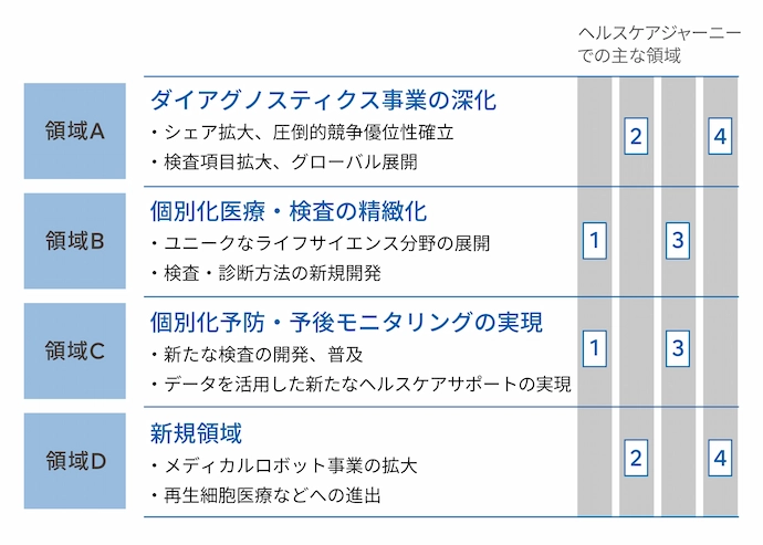 ダイアグノスティクス事業の深化と新規事業の創出により、事業領域を拡大し、より良いヘルスケアジャーニーの実現に貢献します。
