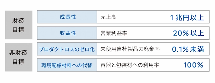 目標達成に向けて、5つの要素で構成される基本戦略を軸に推進し、売上高1兆円以上の企業を目指します。