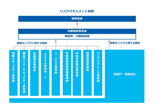 シスメックスでは、グループ全体のリスクマネジメントを統括する体制として内部統制委員会を設置し、事業部門から独立した社長直轄の組織である内部統制室が事務局となり、委員長は取締役社長が務め、メンバーは取締役会長、担当執行役員および常勤監査等委員、オブザーバーは社外取締役が務めています。