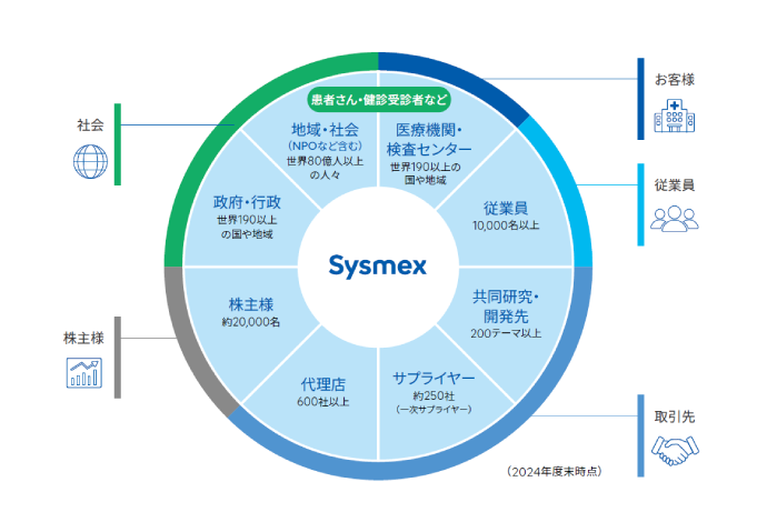 | 株主・ 投資家 | シスメックスは、IR活動を持続的な成長と中長期的な企業価値向上に向けた重要な活動の一つであると認識しています。積極的な情報開示を行うとともに、株主・投資家の皆さまとの対話で得られた評価やご要望は、迅速に社内で共有し、経営・IR活動に反映しています。近年では、資本効率向上や、中期経営計画のローリング見直しに関して投資家様から示唆をいただき、取り組みに反映・強化させました。