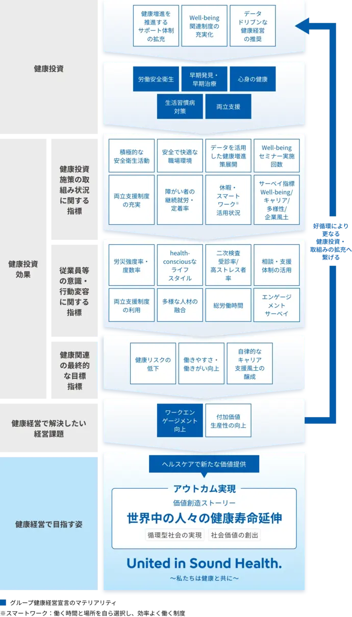 このたび、健康経営マテリアリティに対して、より戦略的な取り組みを進めるべく、「健康経営戦略マップ」を策定しました。今後はグローバルグループの従業員とも連携しながら、グループ従業員の心身の健康だけでなく、働きがいの更なる向上に繋がる取り組みをおこないます。従業員一人ひとりのWell-beingを実現することで、より多くの世界中の皆様の「ヘルスケアジャーニー」に寄り添い、最適な医療の実現に貢献する会社に成長してまいります。