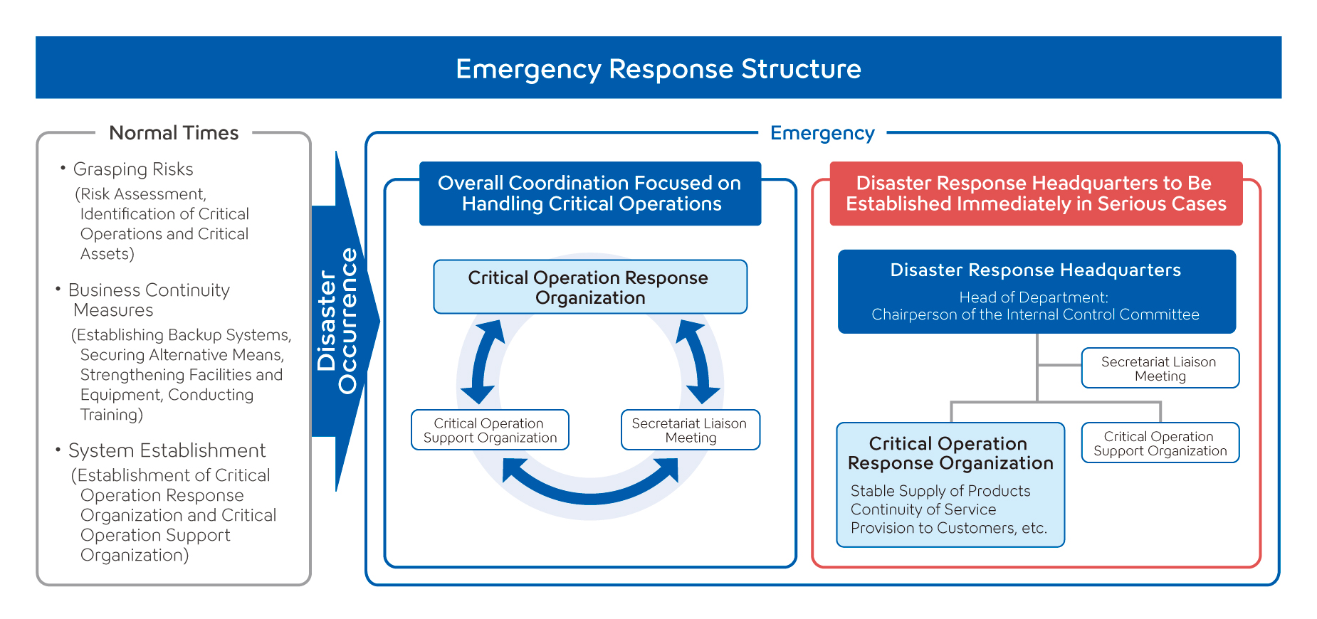We also maintain an organizational structure to ensure a swift and effective response in times of emergency. Specifically, we have established a critical operation response organization that designates a person in charge and the person responsible for each critical operation, enabling this organization to respond to ensure the continuity of each operation in the event of a crisis. We have also established critical operation support organization for general affairs, IT, human resources, public relations, and management, creating a structure to support the continuity of critical business operations.