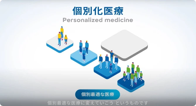 疾患の状態は⼀⼈ひとりで異なるため、同じ病気であっても同じ治療法を適⽤することが必ずしも正しくないことは以前より知られていました。近年では、遺伝⼦解析技術の発展により患者さん⼀⼈ひとりに最適な治療法の選択ができるようになってきています。最適な治療法の選択は、患者さんの⾝体的な負担の軽減だけでなく、医療費の抑制にもつながります。