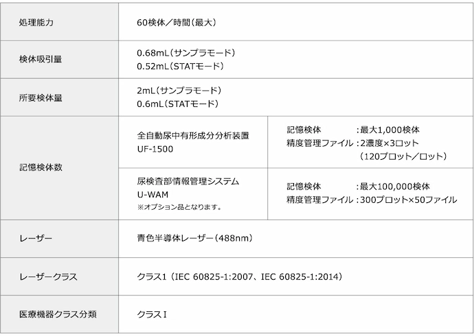 全自動尿中有形成分分析装置 UF-1500は、UF-5000の技術を踏襲し、機能や操作性を高いレベルで継承しながらも、設置面積を約30%縮小※し、省スペース化を実現。要望の多かった指定時刻(日付/曜日)に自動で起動するモードの搭載や、モニター上でスキャッタグラムを表示しその場での確認が可能になりました。