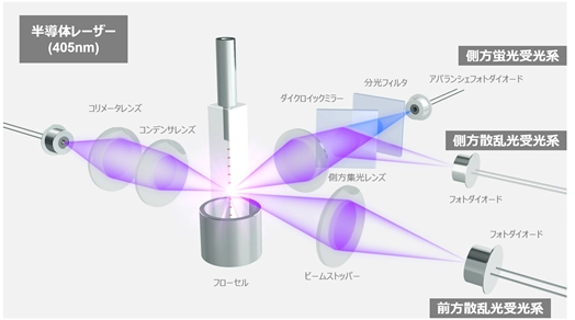 本法では、細胞の大きさを反映する前方散乱光強度と核酸量を反映する側方蛍光強度にもとづいてスキャッタグラムを分析することで、検体中に含まれるマラリア原虫等感染赤血球を測定します。