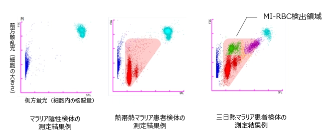 これをフローサイトメトリー法で測定し、前方散乱光・側方蛍光で展開したスキャッタグラムを解析することで、マラリア原虫等感染赤血球数(MI-RBC#)を算出します。またシースフローDC検出法より得た赤血球数との比から、マラリア原虫等感染赤血球比率(MI-RBC%)を算出します。