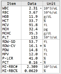 マラリア原虫等感染赤血球の有無や全赤血球数に対するマラリア原虫等感染赤血球の比率(感染率)などの項目に加えて、ヘモグロビンを含むCBC8項目を同時に自動測定できることから、マラリア患者に多いとされている貧血などの状態を一度の測定で把握することが可能となります。