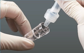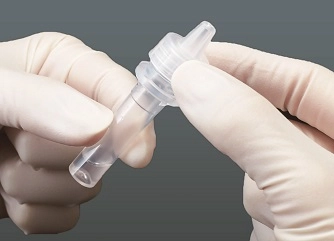 - 1綿球部分がしっかり検体抽出液に浸るように容器を手で挟んでください。