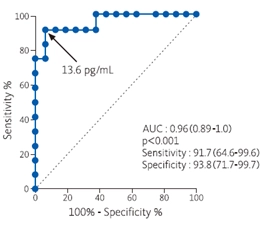 SARS-CoV-2陽性患者の重症化予測診断のカットオフ値:13.6pg/mL(2)