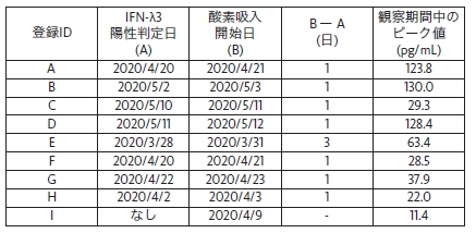 表3は表2の検討結果から、中等症II以上と分類された9症例において、IFN-λ3陽性判定日と、酸素吸入開始日を比較したものです。