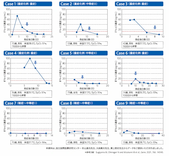 中等症II以上と分類された患者9症例中8症例で、酸素吸入開始日の1〜3日前に、IFN-λ3測定値が陽性であることが確認されました。
