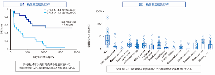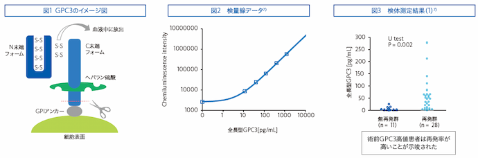 Glypican-3(GPC3)は主に肝細胞癌で発現していることが知られている胎児性膜抗原蛋白質です1)。GPC3は細胞増殖因子と結合することで細胞増殖や分化を制御しており、癌細胞の悪性化に関与していると考えられています2,3)。GPC3は約600アミノ酸から成る蛋白質として合成され、翻訳後修飾によって分子中央部が切断されてN末端側フラグメントとC末端側フラグメントに分かれます4)。この2つのフラグメントは分子内ジスルフィド結合によって結合しており、全長型GPC3としてGPIアンカーを介して細胞膜表面上に存在していると考えられています(図1)5)。また、最近の研究によってその一部が血液中にも放出されていることが明らかになっています6)。当社ではこの血液中に放出されたGPC3の中でも、特に全長型GPC3を高感度かつ特異的に測定可能な手法を構築し(図2)、国立がん研究センターの中面哲也先生との共同研究としてその臨床性能を評価しています。そしてこれまでに、肝細胞癌において切除治療前の血中全長型GPC3濃度が高い患者さんでは再発リスクが高いこと(図3,4)7)、全長型GPC3は健常人や他癌腫と比べ肝細胞癌で高発現していることを明らかにしています(図5)8)。