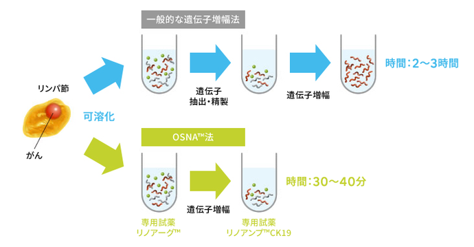 シスメックスでは、前処理(可溶化)液の組成、原料(酵素、プライマー)の最適設計により、核酸精製の工程をなくし、リンパ節中のがん細胞に由来するマーカー(CK19mRNA)をワンステップで測定する技術を開発しました。