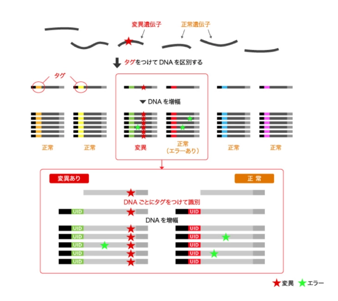 Plasma-Safe-SeqS技術は、増幅対象の遺伝子にタグを付けることで、遺伝子変異と読み取りエラーとを識別します。微量の真の遺伝子変異を正確に検出することでリキッドバイオプシーを実現し、適切な診断・投薬への貢献によって個別化医療の実現を目指します。