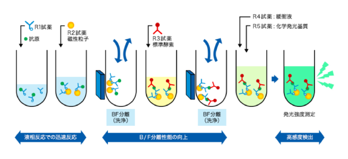 化学発光酵素免疫測定法を測定原理とした、全自動免疫測定装置HISCL®用試薬では、初期の抗原抗体反応を液相で、その後B/F分離において集磁・洗浄・攪拌を最適化させることにより、短時間に効率の良い抗原抗体反応を実現しています。また、標識酵素にアルカリホスファターゼ(ALP)を用い、化学発光基質に強い発光強度を示すCDP-Star®と組み合わせることにより、微量検体(10~30μL/テスト)でも高感度な測定を可能にしました。