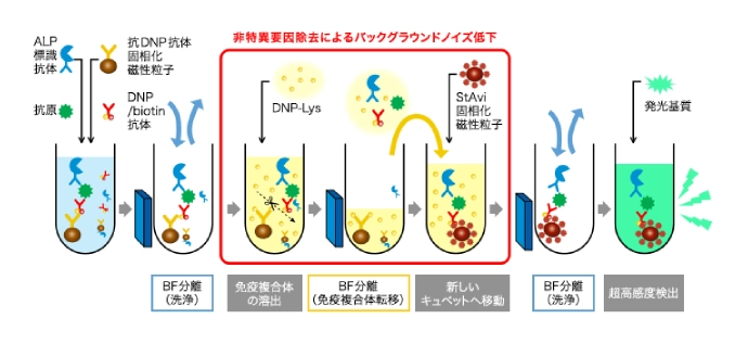 本システムは、測定対象物質が抗体でサンドイッチされた免疫複合体のみを、別の磁性ビーズに転移させ、非特異的なバックグラウンドノイズを約1/100に低減します。