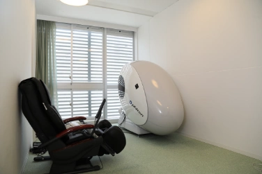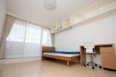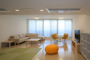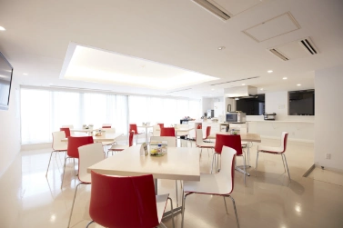 館内は開放感あふれる吹き抜けの構造。「夢に挑戦」するアスリートをサポートするための機能とリラックスできる生活空間を完備しています。