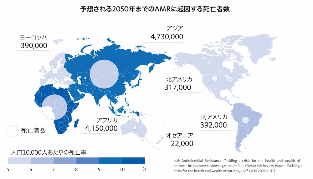 2050年には、AMRが原因で亡くなる人の数は年間1,000万人に上ると予想※1されています。これは、がんによる死者数を上回ると推定される高い数字であり、世界保健機関(WHO)をはじめとするさまざまな団体によりAMRは世界全体で取り組むべき社会的課題として位置づけられています。