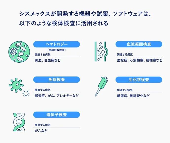 検体検査は、病気の診断や治療方針の決定、治療経過のモニタリングなど、医療に不可欠なものです。そうした検査に必要な機器や試薬、ソフトウェアの研究開発から調達・生産、販売、サービス&サポートまでの一貫したバリューチェーンを有しています。