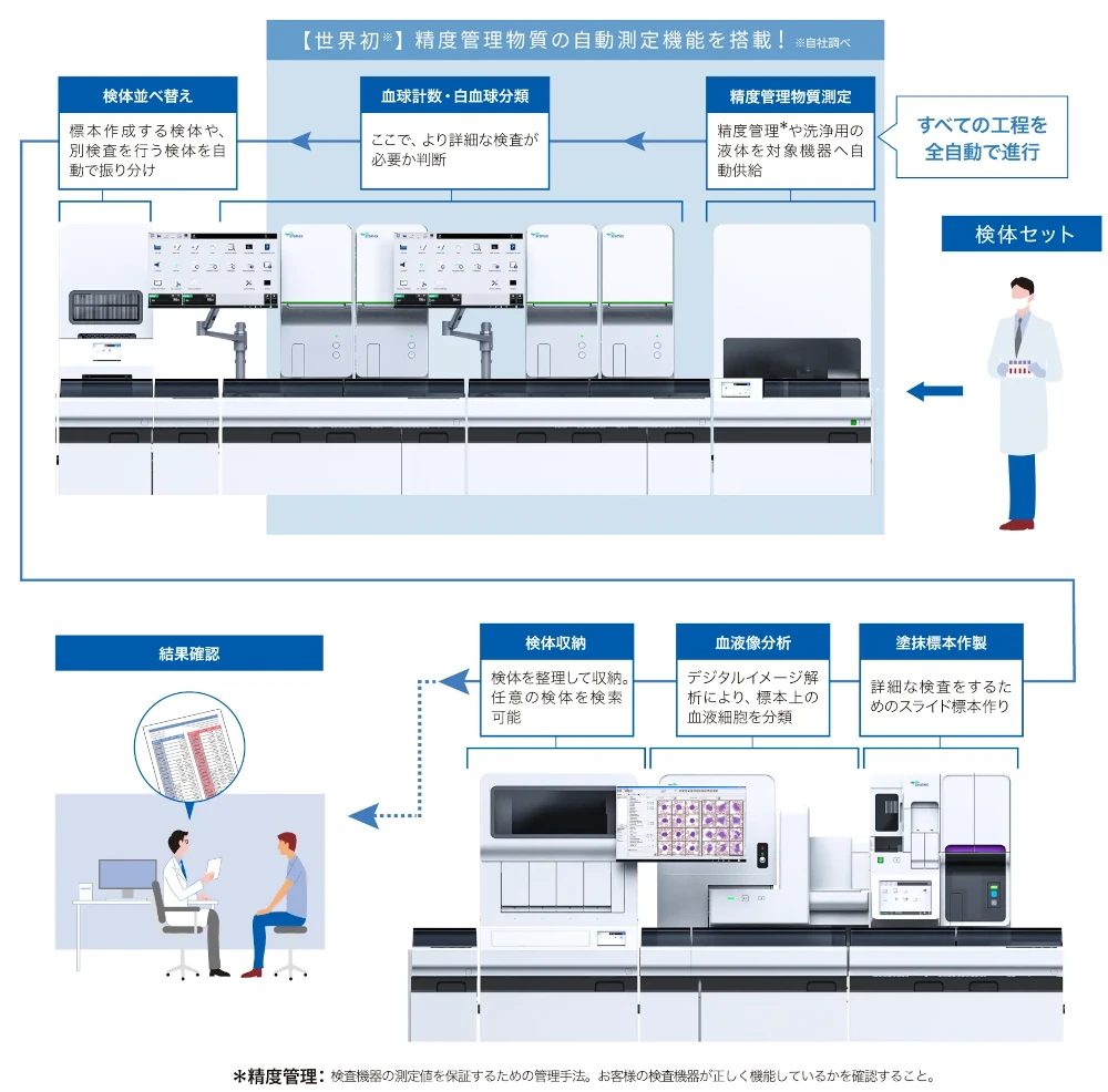 その豊富な経験をもとに、世界初の新機能を搭載した「ヘマトロジー検査システム」をお届けしています。この製品開発の原点は、最初から最後まで人の手を介さず、自動で検査業務を完結する“タッチフリー”という発想です。