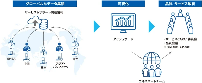 当社では、サービスの品質とスピードを維持し続けるために、世界中のサービス情報や検査機器のログなどのデジタル情報資産をグローバルで共有するプラットフォームを構築し、人や地域、経験の違いに依存しない仕組みを強化しています。今後は、このプラットフォームに蓄積されたデジタル情報資産をAIなどの最新技術と組み合わせることで、プロアクティブなサービスモデルを更に進化させるべく取り組んでいきます。